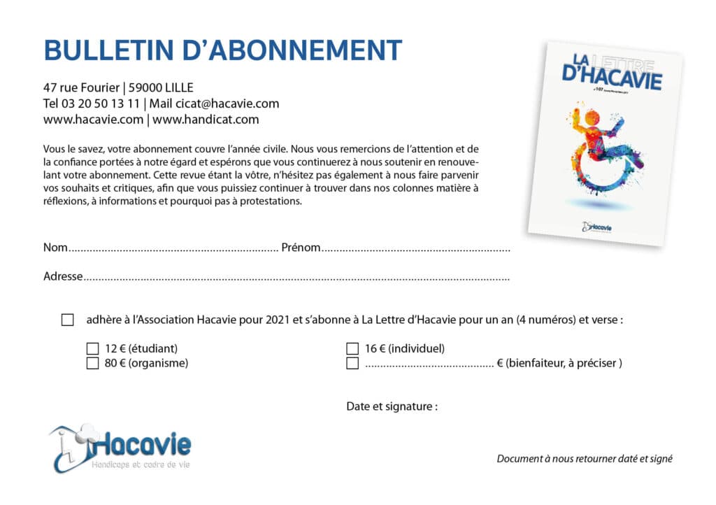 Hacavie est une association loi 1901 spécialisée dans l’information et le conseil auprès des personnes handicapées et/ou âgées et propose aussi ses services d’accompagnement à l’acquisition d’une aide techniques et de maintien à domicile (EQLAAT, MaPrimeAdapt Nord).
