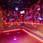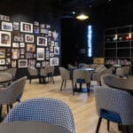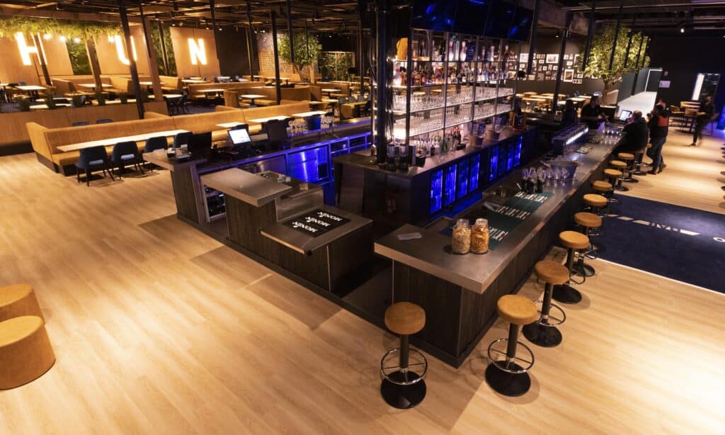 Ce large couloir nous mène ensuite tout droit dans la pièce principale du centre de loisirs. Au niveau de la restauration le service se fait à table, il n’est pas nécessaire de réserver les places PMR au restaurant sauf pour les groupes, particulièrement les jours de forte affluence en fin de semaine et les jours de match (euro2020). De nombreux écrans sont installés, notamment au niveau du bar où les événements sportifs ou musicaux assureront de nombreux moments festifs.