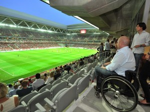 Le stade est sur 3 niveaux (0, 1 et 2). Les places dédiées sont situées en haut des gradins pour les niveaux 0 et 1, et en bas des tribunes pour le niveau 2. Cela permet une évacuation rapide en cas de nécessité. Des espaces d’attente sécurisés sont également prévus.
