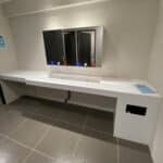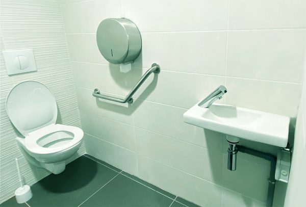 Les toilettes PMR sont fonctionnels, ils disposent d’une aire de transfert latéral. Un lavabo évidé est présent, dépourvu de sèche-main et de savon.Cependant, aucun aménagement pour les personnes souffrant de déficiences visuelles sur les cheminements et en face de chaque boutique. Une application accessible pourrait être envisagée afin de faciliter le repérage et de palier au manque de moyens techniques.