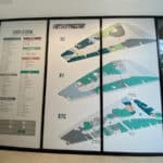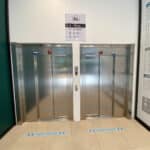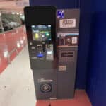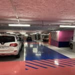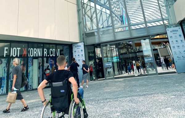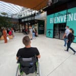 Le parking dispose d’un système lumineux indiquant les places disponibles. (rouge places occupées, vert places libres et bleu pour les places PMR qui sont situées au plus proche des entrées). Une borne de paiement est accessible pour les personnes en fauteuil. Il dispose de la fonction « borne T » pour les personnes disposant d’un appareil auditif. Les portes pour accéder à l’ascenseur et à l’escalier menant au centre commercial ne disposent pas d’un système d’ouverture automatique ou facilitant la manipulation pour une personne en fauteuil. Les portes sont assez lourdes et très difficile à manœuvrer même pour une personne valide. L’ascenseur est accessible, il dispose d’un grand miroir, de deux longues barres d’appui ainsi qu’un retour sonore pour chaque étage desservi. A la sortie de l’ascenseur, un énorme plan du centre figure sur le mur. Cependant une fois dans les allées, la signalétique est faible. Une signalétique transversale au cheminement indique le nom des magasins (écriture blanche sur fond noir).