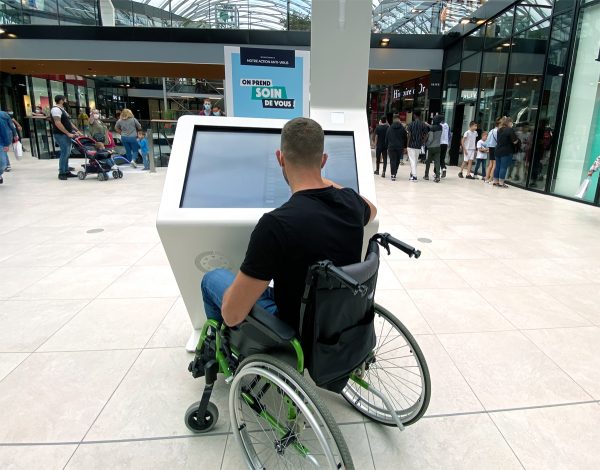Des bornes tactiles sont à disposition afin de se repérer dans cet immense centre. Sa hauteur est accessible en fauteuil. Malheureusement aucun retour sonore a été prévu ce qui est bien dommage pour les personnes malvoyantes. En revanche, il est possible de se faire envoyer par SMS l’itinéraire vers le magasin où l’on souhaite se rendre. Nous n’avons aperçu aucune information pour trouver un ascenseur menant au parking. Pour les personnes aveugles, aucune signalétique au sol n’indique l’entrée des magasins. Une bande podotactile prévient tout de même de la position d’un escalier. Aucun ressaut ne figure sur le cheminement. En venant par les transports en commun (bus, métro, …), l’accès à Lillenium se fait via de larges portes automatiques donnant sur de grandes allées. Pour accéder aux différents étages, 3 choix sont possibles : ascenseur, escalator ou escaliers.