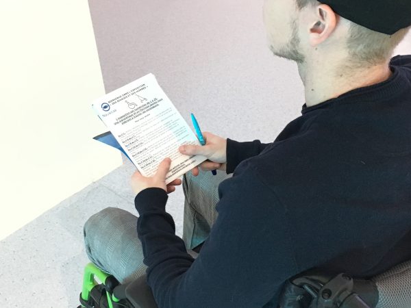 A l’accueil un plan de la visite est proposé. Sur fond blanc et écriture bleu, les informations sont claires. Ce plan indique les toilettes accessibles et les ascenseurs. Des plates-formes élévatrices sont également à disposition. Les expositions sont numérotées. Un code couleur est mis en place afin de mettre en avant les expositions vedettes de Nausicaa tel que l’aquarium des requins. En complément du plan, des explications détaillées sur les chemins à prendre sont fournies sur papier pour retrouver facilement les ascenseurs et suivre ainsi l’ordre chronologique de l’exposition.