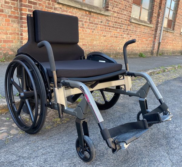 Son châssis est en aluminium. Les freins sont faciles d’accès, non proéminent et plutôt discrets. Ils sont situés entre la roue arrière et le protège-vêtement. 2 longueurs de tubes sont disponibles : de 36,5 à 52,5 cm. Les palettes peuvent être réglables en angle, en profondeur et en largeur. Des palettes fixes seront disponibles également. Des poignées de transfert, de série, sont réglable en hauteur et orientables :