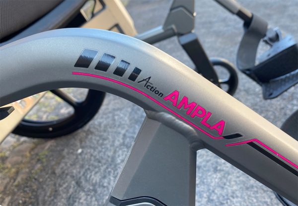 L’Ampla a un poids de transport à partir de 19,5 kg. Le châssis est fixe mais le passage de porte est facilité grâce au système permettant de déplacer le fauteuil à la verticale grâce à un système breveté 4 roulettes assurent un déplacement aisé du fauteuil pouvant tourner à 360°. La largeur du passage du fauteuil peut être ainsi réduit à environ 70 cm. 3 autocollants de couleurs modernes (vert pulsé, rose pulsé ou bleu pulsé) sur les 2 potences sont possibles sans supplément de prix.