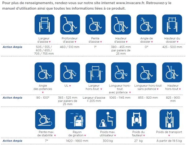 Lorsque les poignées ne sont pas utilisées, elles peuvent être abaissées pour s’approcher au plus proche des tables ou tout simplement être retirées. Ces poignées sont réglables en hauteur de 22 cm à 27 cm par palier de 2,5 cm. Le fauteuil bariatrique avant l’Ampla proposé par Invacare était le Topaze où différents problèmes ont été relevés : accès restreint aux mains courantes (dossier haut et accoudoirs gênant l’accès), difficile à manœuvrer pour tierce personne, peu esthétique et lourd (40 kg).