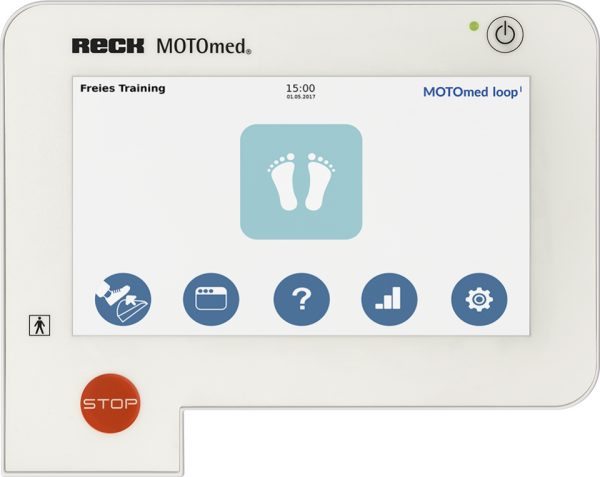 Successeur du Motomed Viva 2, le Motomed Loop a un aspect moderne. Il dispose de pédaliers afin d’entraîner les jambes et les bras de manière indépendantes. L’écran tactile en couleur de 7 pouces assure une facilité d’utilisation. L’écran est inclinable. Il est possible d’afficher ses propres photos et de créer ses propres programmes (nombres illimités). Lors de l’entraînement, l’écran affiche des informations telles que la symétrie, la puissance, la vitesse, la distance, la durée… L’entraînement est analysable en l’exportant sur clé USB. Les repose-pieds disposent de fermeture par velcro. Le système peut être réglé sur 5 niveaux de hauteur (sans dissociation des pieds et des bras).