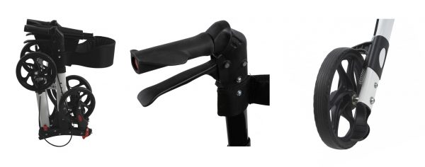 Les roues font 20 cm de diamètre et sont en caoutchouc souple et anti-glisse. Le freinage est simple et permet également la position parking. Son cadre est en aluminium. Les poignées ergonomiques en caoutchouc souples sont ajustables en hauteur de 82 à 94 cm. Une bande de tissu fait office de dossier galbé. Une sacoche amovible et un porte-canne sont livrés avec ce déambulateur.
