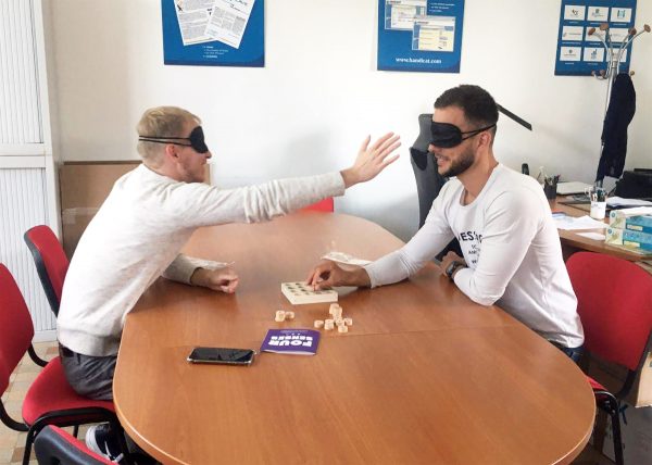 FOUR SENSES est un jeu de société dont l’auteur est Mitsuo Yamamoto et le design a été établi par Florian Bellon. Jeu pour 2 à 3 joueurs à partir de 8 ans. Une partie dure en moyenne 10 à 20 minutes. Ce jeu se pratique en enlevant un des 4 sens : la vue. L’utilisateur sera dans une position où il sera dépourvu de la vision afin de se concentrer uniquement sur le sens du toucher. Cette expérience inhabituelle amène une autre façon de jouer. Ce jeu de logique et de stratégie peut convenir à de nombreuses personnes notamment ceux ayant des troubles de la vision (DMLA, Cécité …).