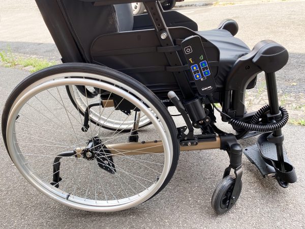 Un appui-nuque multi-réglable assure un confort notamment lors de la bascule d’assise et de dossier. La télécommande filaire dispose de larges boutons contrastés. La couleur verte a été identifiée pour la bascule d’assise et la couleur jaune pour l’inclinaison de dossier. Un verrouillage de 1 ou 2 fonctions est possible. La télécommande présente aussi le niveau de batterie restant. Elle s’attache via un crochet à fixer sur le protège vêtement. Le branchement du chargeur a été facilité par un système d’aimant.