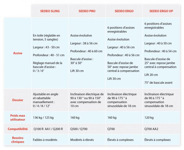 A savoir que toutes les assises ne vont pas avec toutes les bases motrices. Une base motrice répondant à des besoins cliniques élevés ne sera pas compatible avec l’assise SEDEO SLING (besoins cliniques faibles). Des accessoires sont également disponibles (voir sur site fabricant).