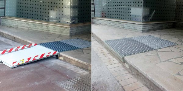 Il s’agit d’une rampe escamotable frontale. Elle permet de rendre accessible le franchissement de marches notamment pour les Établissements Recevant du public (ERP). La hauteur de la marche ne doit pas excéder 35 cm. La rampe est encastrable et rétractable afin de ne pas gêner la voirie et préserver le domaine public (trottoirs). Aucune perte de surface n’existe car la rampe s’encastre dans le seuil. Sa manipulation est manuelle. La largeur pour le passage est de 78 cm. Pour plus de sécurité lors du franchissement, elle est dotée de chasse roues de 7 cm.
