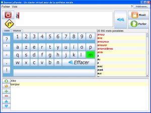 Dès l’ouverture, le dictionnaire se charge et l’on peut commencer à saisir des phrases sur le clavier visuel qui seront lues par la synthèse vocale après avoir cliqué sur le bouton « parler ». Le dictionnaire situé à droite du clavier s’adapte à la saisie et vous propose des listes de mots correspondants.