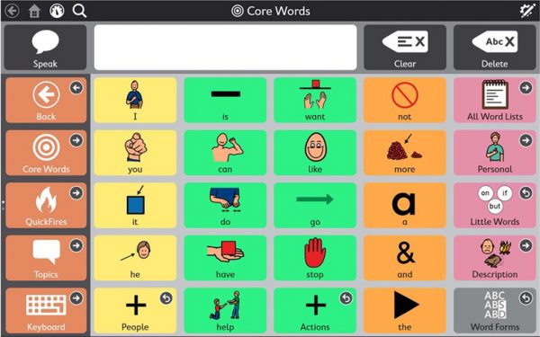 Snap + Core First est une application de CAA (Communication Alternative et Augmentée) robuste basée sur les symboles. Compatible sur tablette sous le système d’application IOS et Windows. Cette application a été créée par 5 orthophonistes, 3 développeurs et 1 UX designer (spécialiste dans l’interface homme-machine) avec une consultation d’équipe dans les domaines des contenus éducatifs, appareils… La philosophie de cette innovation est la communication, l’accessibilité et le développement. Au démarrage, vous devez créer un compte, entrer votre prénom, choisir la voix de synthèse et la taille de la grille (1×1 / 1×2 / 2×2 / 2×3 / 3×3 / 3×4 / 4×4 / 5×5 / 6×6 / 7×7 / 7×9 / 8×10). Cette application est formée par du vocabulaire courant : 60 à 80 % des mots sont utilisés lors d’une conversation classique. La grammaire, la conjugaison et les contractions se font de manière automatique (exemple « je ne aime pas » se traduira par « je n’aime pas ». Deux cases permettent de basculer entre le masculin/féminin et singulier/pluriel. Les pronoms sont également proposés : le « je » se change en « me ».