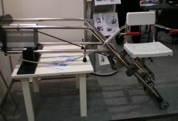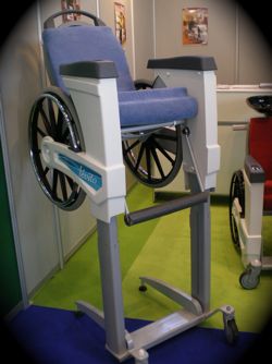 - La société allemande Hoyer a conçu un nouveau siège de transfert pour la piscine transportable, le Stairless. Le siège est monté sur un rail. Il supporte un poids allant jusqu’à 150 kg. La personne se transfère ou est transférée sur le siège à l’aide d’une tierce-personne. Ensuite, le siège coulisse le long du rail jusque l’eau. Le système fonctionne sur batteries (24 V). Pour le moment, la société n’envisage pas de chercher de distributeur en France. Quel dommage !