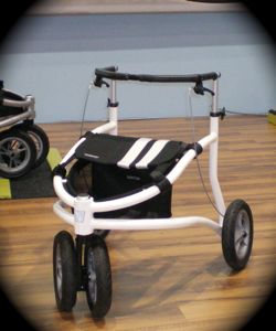 Le Trionic Walker est un déambulateur tout terrain ! Il dispose de 4 roues à démontage rapide : 2 à l’avant et 2 à l’arrière. Les deux roues avant sont reliées entre elles et fonctionnent conjointement, comme une troisième roue à l’avant. Le châssis en aluminium est pliant. Le poids de l’utilisateur ne doit pas excéder 150 kg. Il pèse 11 kg, 7 kg sans les roues. Il peut franchir des bordures d’une hauteur de 13 cm.