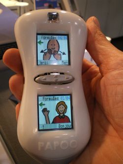 Nous avions eu contact avec la société Smartio Systems, qui a développé un outil d’aide à la communication portable et ergonomique, le Papoo. Celui-ci était présenté sur le stand de Proteor qui se chargera de sa commercialisation. Le Papoo sera disponible aux environs de 2000 € à partir de mars 2008.