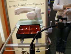 - Le concepteur de Gripability nous a présenté son produit du même nom : lui-même tétraplégique (donc paralysé et privé notamment de l’usage des mains), il en est utilisateur. C’est une pince de préhension placée sur le poignet. Elle fonctionne grâce à de l’air comprimé et un moteur placé derrière le dossier de fauteuil. L’air comprimé peut se recharger à l’aide d’une pompe ou d’un compresseur. La recharge d’air est nécessaire au bout de 300 à 400 ouvertures. La pince est réglable sur 3 niveaux en fonction des caractéristiques de l’objet à prendre. Ces réglages s’effectuent grâce à un boîtier (comparable à un manipulateur de fauteuil) pla cé par exemple en bout d’accoudoir du fauteuil. Différentes types de pinces sont disponibles. Le Gripability est commercialisé en Allemagne au prix de … 8500 €.