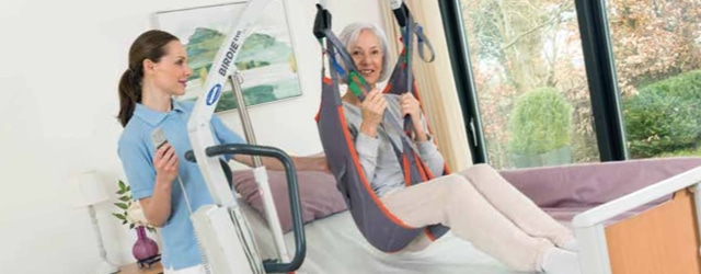 Gamme de lève-personnes mobiles pour les transferts au lit ou depuis le lit, la chaise ou le sol.