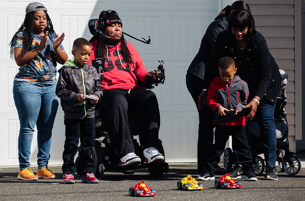 Ici, on adapte les jouets non pas aux enfants handicapés mais aux parents en situation de handicap et plus précisément, des parents atteints de paralysie, qui souhaiteraient continuer à échanger via le jeu avec leur(s) enfant(s)