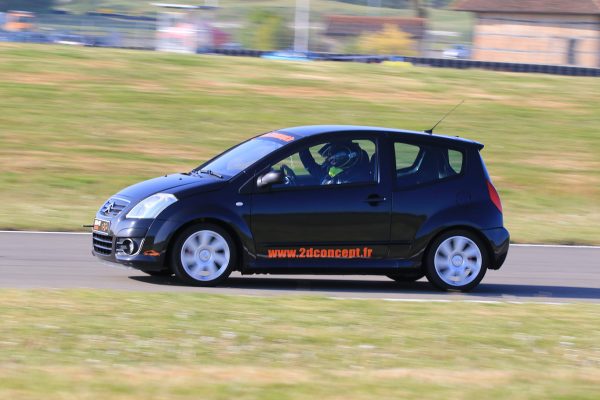 • Une Citroën C2 VTR avec conduite équipée d’un accélérateur par cercle électronique sur volant couplé à un frein de service à main placé sous le volant. Elle est vidée et dispose d’un châssis renforcé, 4 amortisseurs course et un freinage d’échappement. Au niveau du moteur, il y a une ligne d’échappement groupe N et un boîtier électronique reprogrammé. Un harnais pour le conducteur ainsi que pour le passager est installé pour un maintien optimal.